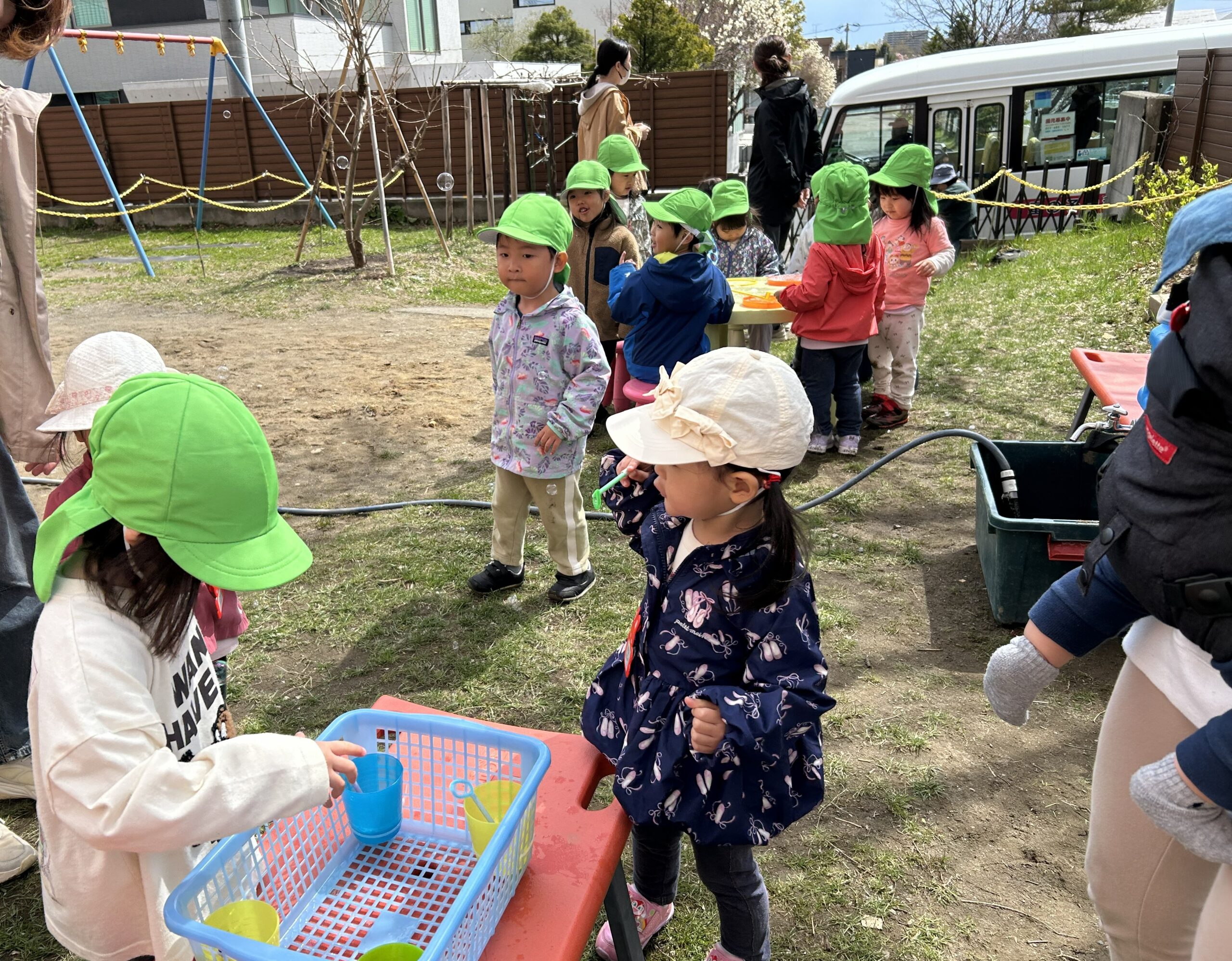 今年度初めてのすくすく広場がありました。朝雨が降りましたが、晴れてくるだろうと園庭に出ました。園児が遊んでいる様子を見て同じように砂遊びやシャボン玉で遊び始めたのですが、雨がぽつぽつと降ってきて、急遽室内に入りました。次回はゆっくりと遊びたいと思います。