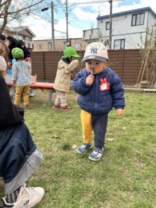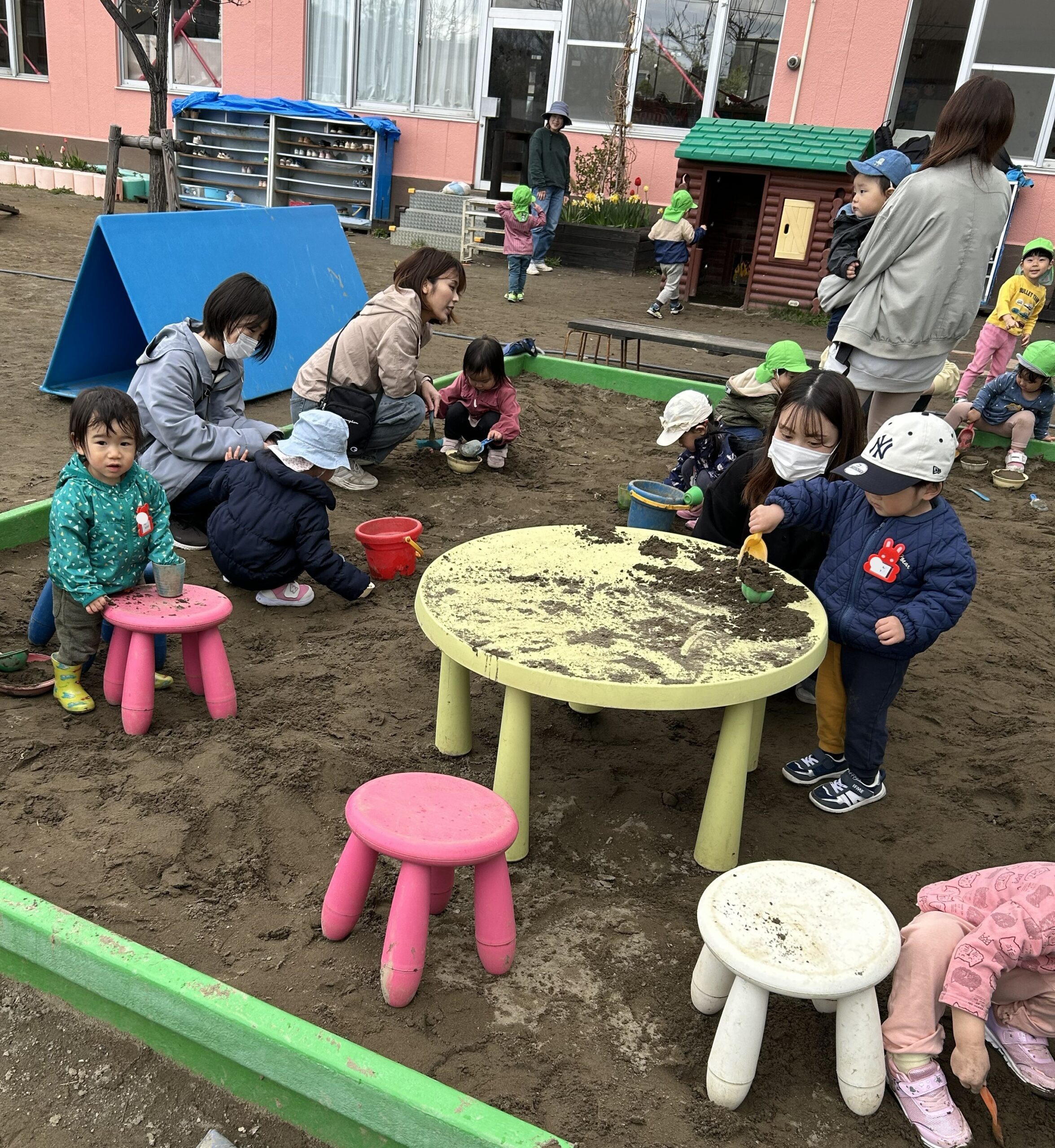 次回5月7日(木)は天気が良ければ、園庭で遊びます。砂場で遊んだり山に登ったりもすると思いますので、汚れてもいい服装でお越しください。天気が悪ければ室内で遊びます。